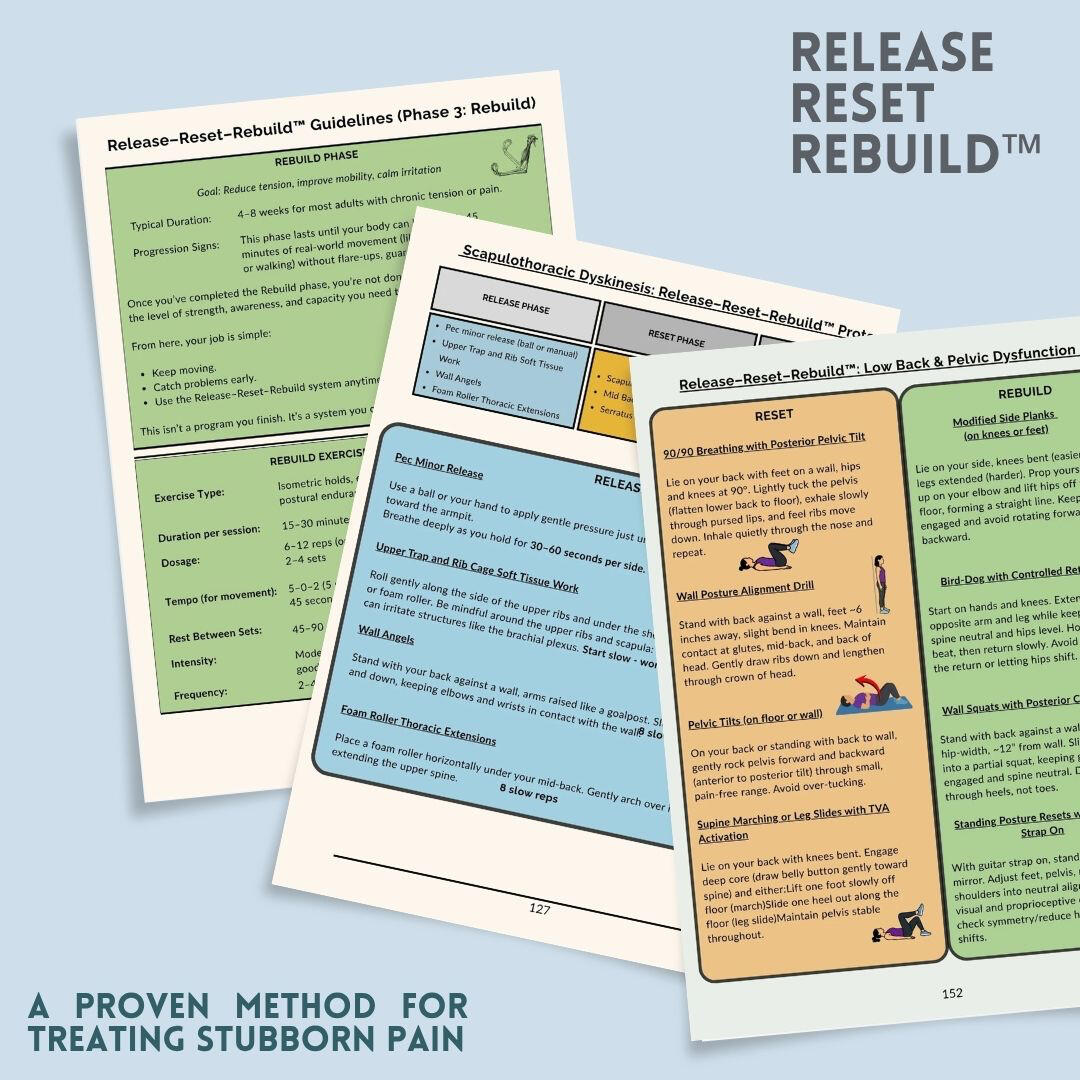 Every section follows the Release–Reset–Rebuild model:• Phase 1: Reduce pain and tension