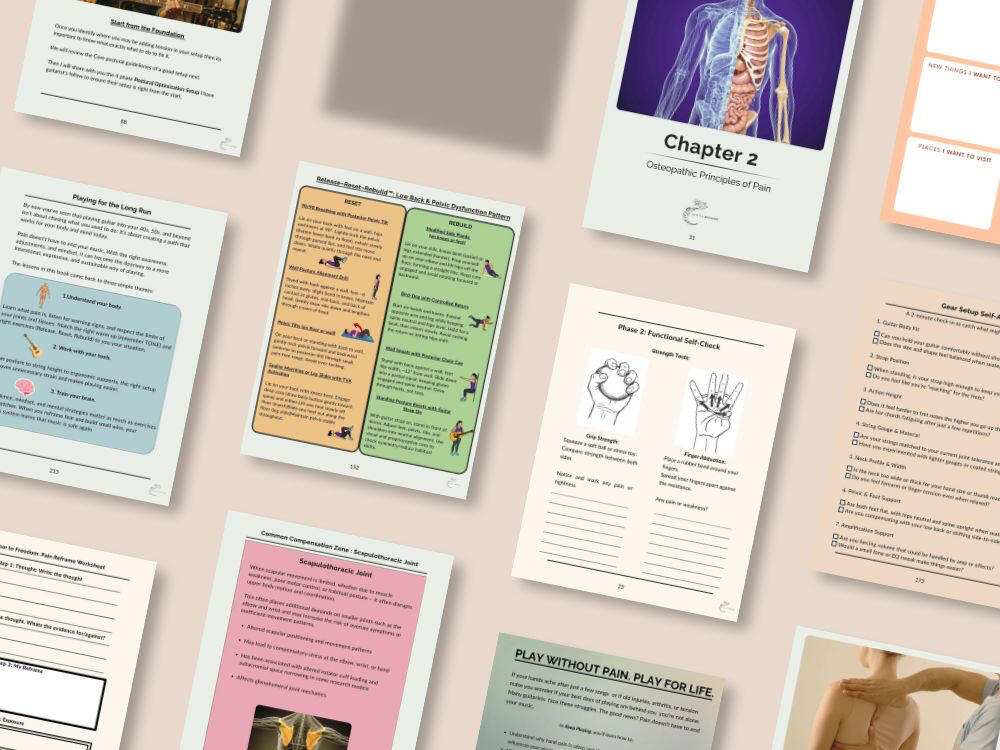 Each phase guides you in understanding your body, adjusting your technique, and building more sustainable patterns for long-term comfort and confidence.Includes the Complete 3-step plans for:• 3 core dysfunctions• 6 common pain patternsIncludes complete steps by step routines for 6 of the most commonly observed patterns in musicians including:Cervical Radiculopathy Pattern, Ulnar Nerve Entrapment Pattern, Shoulder Blade Collapse Pattern, Outer Elbow Pain Pattern, Low Back & Pelvic Dysfunction Pattern and Forearm Flexor Tendinopathy Pattern.• Includes movement flows, visual demos, and daily-use guides• Built for aging joints, busy lives, and real recovery